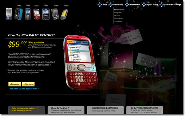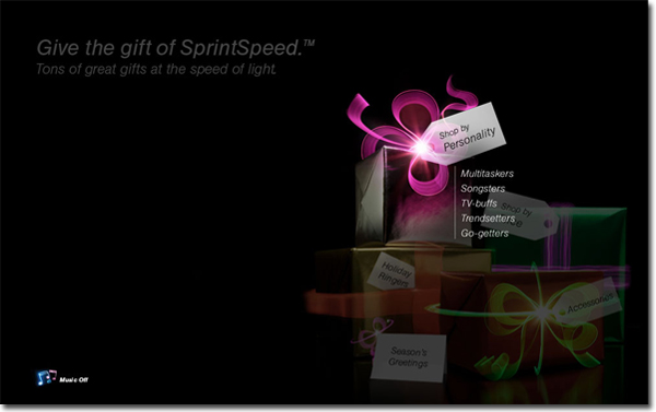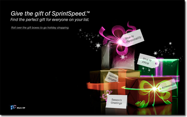 This Sprint 2007 Holiday site went live on December, 2007. By accessing into Sprint Holiday Site with holiday gift boxes, audiences can navigate site by phone's personality, price, accessories, ringers, and greetings.