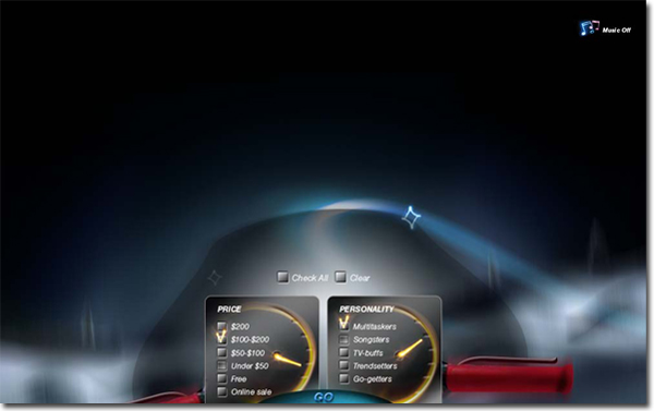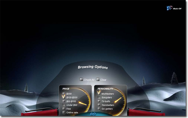 One of concepts of Sprint 2007 Holiday site. By snow mobile gauges, audiences can navigate phones. All phones sorted by personality, price, or both.